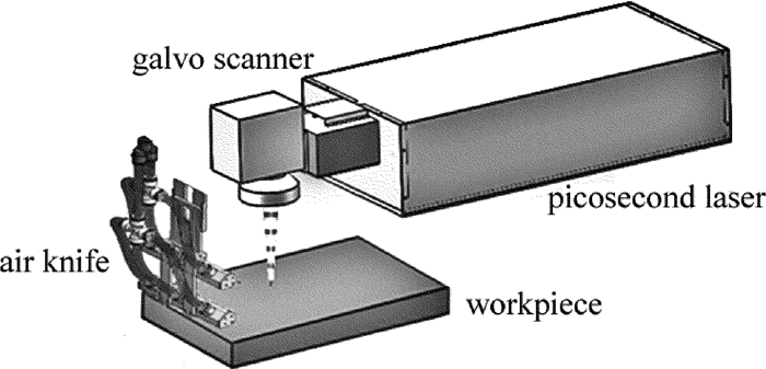 實(shí)驗(yàn)中采用的切割系統(tǒng)如圖 1所示。系統(tǒng)采用EdgeWavePX200-2-GM型皮秒激光器,通過3維掃描振鏡實(shí)現(xiàn)z方向動(dòng)態(tài)聚焦,使用空氣作為輔助氣體,并通過氣刀作用于工件表面,氣體壓力為0.8MPa,實(shí)驗(yàn)采用超景深3維顯微鏡觀測(cè)掃描深度和熱影響區(qū)。