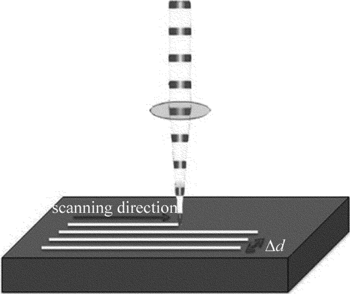 實(shí)驗(yàn)方法如圖 2所示。將1.5mm厚CFRP板置于激光焦平面上,分別研究平均功率、掃描速率、重復(fù)頻率、掃描次數(shù)對(duì)熱影響區(qū)及掃描深度的影響。為了更加均勻地去除整個(gè)碳纖維復(fù)合材料和提高去除效率,對(duì)軌跡進(jìn)行多次循環(huán)掃描,并通過動(dòng)態(tài)聚焦系統(tǒng)實(shí)現(xiàn)焦點(diǎn)補(bǔ)償。在切割中為了避免切縫過窄造成的遮蔽效應(yīng),掃描若干條間距為Δd的平行軌跡來增加切縫寬度,最終實(shí)現(xiàn)1.5mm厚CFRP切割。