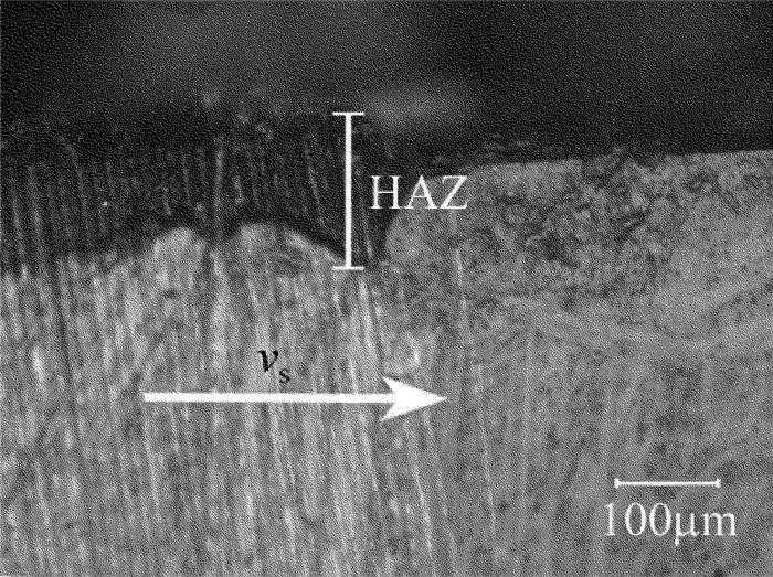 激光功率為60W、重復(fù)頻率為0.4MHz、掃描速率為4m/s時(shí),CFRP表面產(chǎn)生的熱影響區(qū)如圖 3所示。從圖中可以看出,在切割過程中環(huán)氧樹脂基體材料回縮,而表層碳纖維增強(qiáng)體并未被去除而裸露出來形成熱影響區(qū)。這是因?yàn)榄h(huán)氧樹脂氣化溫度為700K,而碳纖維T300的氣化溫度為4000K,所以當(dāng)激光能量不足夠使碳纖維氣化而僅僅只能使環(huán)氧樹脂氣化時(shí),氣化的環(huán)氧樹脂被輔助氣體吹除,碳纖維保留在切縫兩側(cè)裸露出來形成熱影響區(qū)。