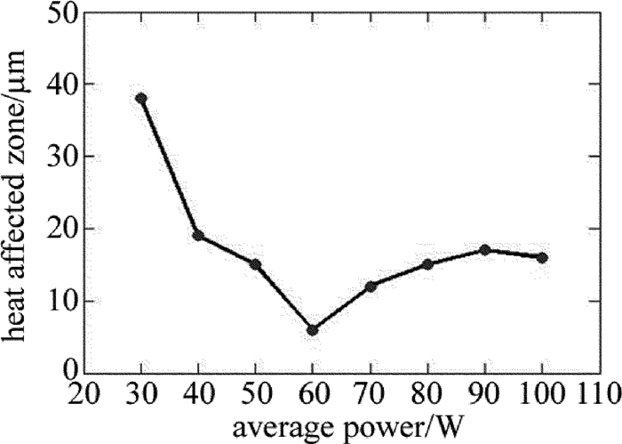 圖 5是當(dāng)重復(fù)頻率為0.4MHz、掃描速率為10m/s時(shí),平均功率與熱影響區(qū)的關(guān)系。由圖 5可以看出,當(dāng)平均功率增加時(shí),熱影響區(qū)逐漸減小,隨著平均功率的繼續(xù)增加,熱影響區(qū)逐漸增大,最后趨于穩(wěn)定。由于在重復(fù)頻率、掃描速率不變時(shí),隨著平均功率的增加,單脈沖能量也增大,達(dá)到材料燒蝕閾值的能量也更多,激光脈沖能量更有效地用于CFRP的去除,有利于提高單脈沖能量的利用率,使得熱損傷相應(yīng)的減小,從而熱影響區(qū)減小。然而,當(dāng)功率過高時(shí),去除材料后剩余的能量也越多,導(dǎo)致能量的積累越多,使得熱損傷相應(yīng)的增加,從而熱影響區(qū)增大。由圖 5可知,當(dāng)平均功率為60W時(shí),此時(shí)熱影響區(qū)小,約為5μm。