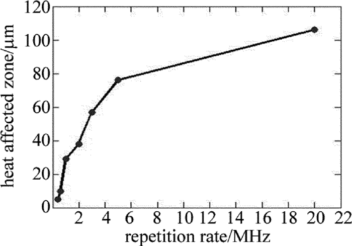 圖 6是平均功率為60W、掃描速率為10m/s時(shí),重復(fù)頻率與熱影響區(qū)的關(guān)系。在圖 6中,重復(fù)頻率為0.4MHz~5MHz時(shí)熱影響區(qū)與重復(fù)頻率幾乎成正比關(guān)系,隨著重復(fù)頻率的繼續(xù)增加,熱影響區(qū)增大并趨于平穩(wěn)。主要是因?yàn)樵谄骄β省呙杷俾什蛔儠r(shí),隨著頻率增加,單脈沖能量減少,達(dá)到燒蝕閾值的能量也減少,所以脈沖能量用于CFRP的去除效率更低,使得熱損傷增大;另外,隨著頻率的增加,相鄰脈沖的時(shí)間越短,積累的熱量也越多,使得熱損傷相應(yīng)的增加,從而熱影響區(qū)增大。