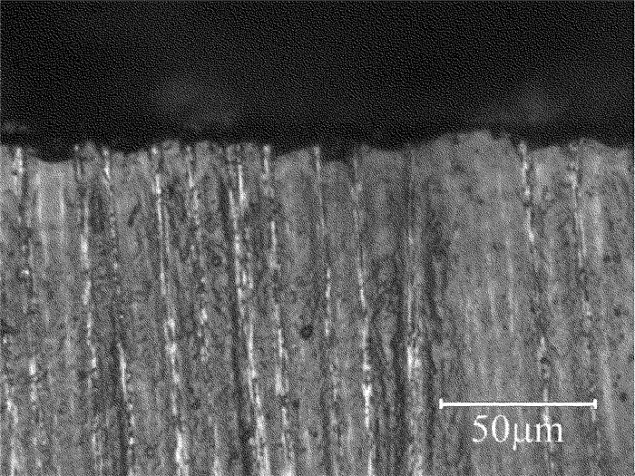 基于以上優(yōu)化的工藝參量,在激光功率為60W、重復(fù)頻率為0.4MHz、掃描速率為10m/s時(shí),CFRP邊緣表面的形貌如圖 8所示。由圖可以看出,邊緣表面熱影響區(qū)非常小。