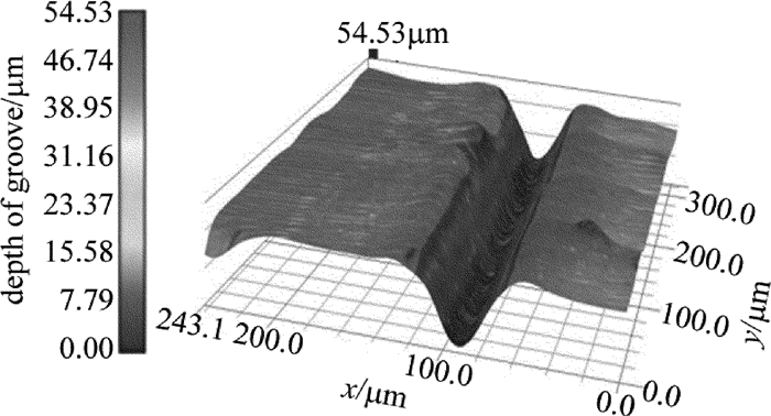 為了得到合適掃描深度,探究了循環(huán)掃描次數(shù)對(duì)掃描深度的影響規(guī)律,在上述實(shí)驗(yàn)的基礎(chǔ)上選擇合適的工藝參量:平均功率60W、重復(fù)頻率0.4MHz、掃描速率10m/s,選取循環(huán)掃描次數(shù)分別為3, 5, 10, 20, 50, 100進(jìn)行實(shí)驗(yàn),通過超景深3維顯微鏡來測(cè)量其掃描深度和寬度。圖 9為掃描次數(shù)為20時(shí)切縫微觀形貌的分層設(shè)色圖。圖中顏色由灰色向黑色過渡表示掃描深度的增加,黑色表示掃描深度較大,由圖可以看出,此時(shí)掃描寬度為50μm左右,深度約為40μm。
