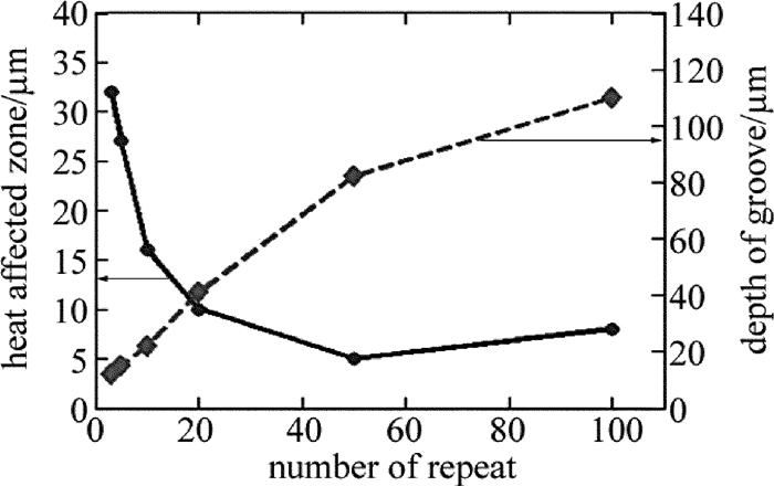 (3) 掃描深度隨著掃描次數(shù)的增加呈非線性增加,而隨著掃描次數(shù)的增加熱影響區(qū)有一定的減小,當(dāng)重復(fù)掃描20次時(shí),可以保證熱影響區(qū)較小的同時(shí)有較高去除效率。