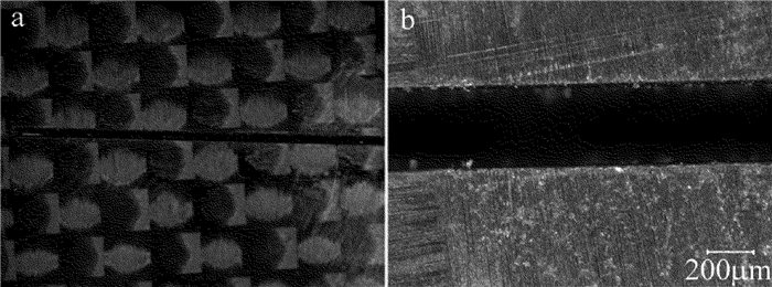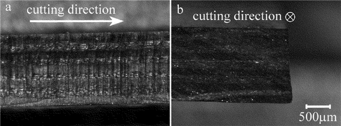為了進(jìn)一步探究切割質(zhì)量,對(duì)切割后的切縫截面進(jìn)行放大觀察,如圖 13所示。從圖 13a可以看出,切縫表面沒有纖維拔出現(xiàn)象及明顯的熱影響區(qū),但是切縫表面略有不平整,這是因?yàn)榧す饽芰吭诳臻g上服從高斯分布,同時(shí)在重復(fù)頻率比較低且掃描速率較快的工藝參量下切割,使得切縫表面不平整。從圖 13b可以看出,切縫有一定的錐角,這是因?yàn)榧词箳呙柽^程中采用了動(dòng)態(tài)聚焦系統(tǒng),掃描靠近切縫兩側(cè)的軌跡時(shí),激光遮蔽效應(yīng)仍無法避免,導(dǎo)致進(jìn)入下表面的激光能量少,對(duì)材料的去除效果差,形成了上表面寬下表面窄的切縫,從而切縫產(chǎn)生錐角。