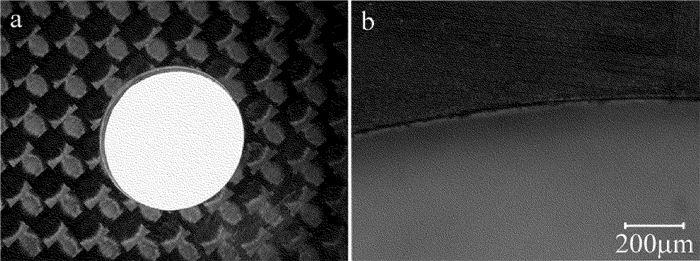 圖 11a和圖 12a分別是在優(yōu)化工藝參量下對(duì)1.5mm厚碳纖維板進(jìn)行直線、圓孔切割的實(shí)驗(yàn)結(jié)果;圖 11b和圖 12b分別是對(duì)切割后直線、圓孔邊緣放大圖。從圖 11和圖 12可以看出,切縫邊緣表面沒有纖維拔出現(xiàn)象,也沒有明顯的熱影響區(qū),得到較好的切割質(zhì)量。
