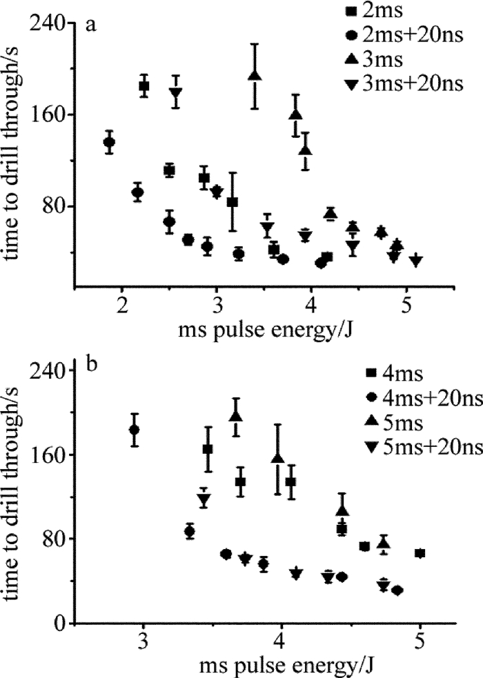 Figure 4. Time to drill through 304 stainless steel vs. ms pulse energy by ms laser drilling and by ms laser drilling superposed by ns laser