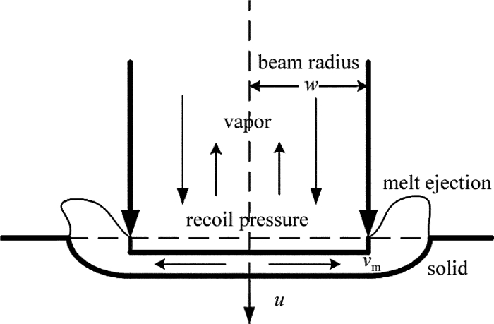材料去除主要有以下3種排出機制:當金屬表面溫度略高于熔點,材料部分熔化,形成熔池,液體排出速率緩慢,通常可采取輔助氣體的方式加速液體排出;增大激光功率密度,提高液體表面溫度,部分液體蒸發(fā),氣體體積迅速膨脹,產(chǎn)生向下的反沖壓強作用于熔融液體表面,使液體濺射逸出,此時,蒸發(fā)反沖壓強是流體力學機制下液體排出作用區(qū)的主要因素;若激光功率密度繼續(xù)增加,表面溫度進一步上升,則熔融液體在到達作用區(qū)邊沿前便已蒸發(fā),此時材料更多以蒸發(fā)的方式排出[9]。本文中主要討論以蒸發(fā)反沖壓強為主的液體排出機制下,激光打孔速率與激光能量的關(guān)系。