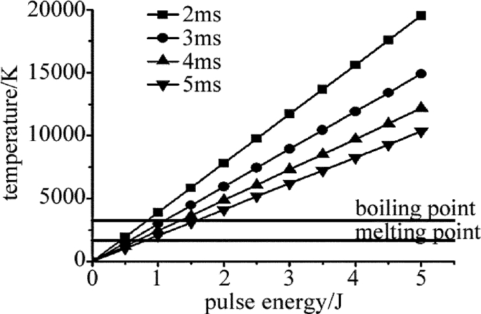 由(1)式得到不同脈寬下毫秒激光單脈沖能量與不銹鋼材料表面溫升的關(guān)系曲線,如圖 6所示。根據(jù)計算可知,使不銹鋼表面達到熔點所需的激光能量約為其達到沸點的一半。以脈寬為5ms的長脈沖為例,使不銹鋼表面達到熔點的單脈沖能量為0.82J,達到沸點的單脈沖能量為1.58J。當脈沖能量相同時,脈寬越窄,峰值功率密度越大,材料的表面溫升越高。納秒脈沖的峰值功率密度遠大于毫秒脈沖,疊加后使材料表面溫度進一步升高。