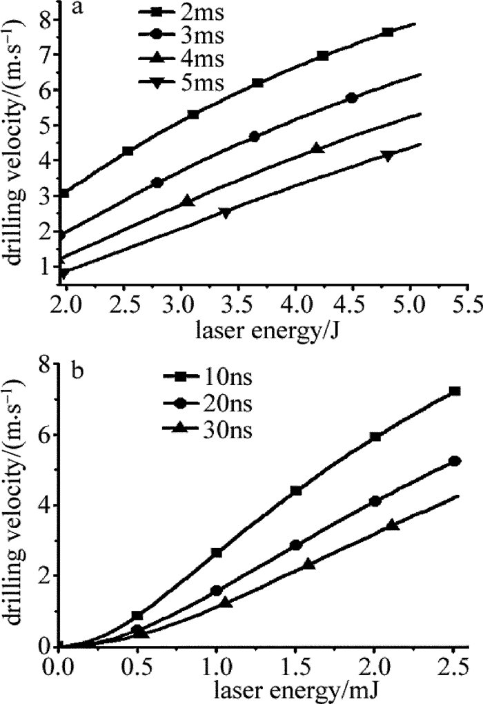 在單獨采用長脈沖打孔,考慮蒸發(fā)反沖壓強濺射熔融物質(zhì)為主的模型中,長脈沖激光能量加熱材料形成熔池,同時產(chǎn)生蒸發(fā)反沖壓強排出液體,脈寬5ms的激光單脈沖能量需大于1.58J,根據(jù)(1)式~(7)式,得到不同脈寬作用下,打孔速率與脈沖能量的關(guān)系,如圖 7a所示。